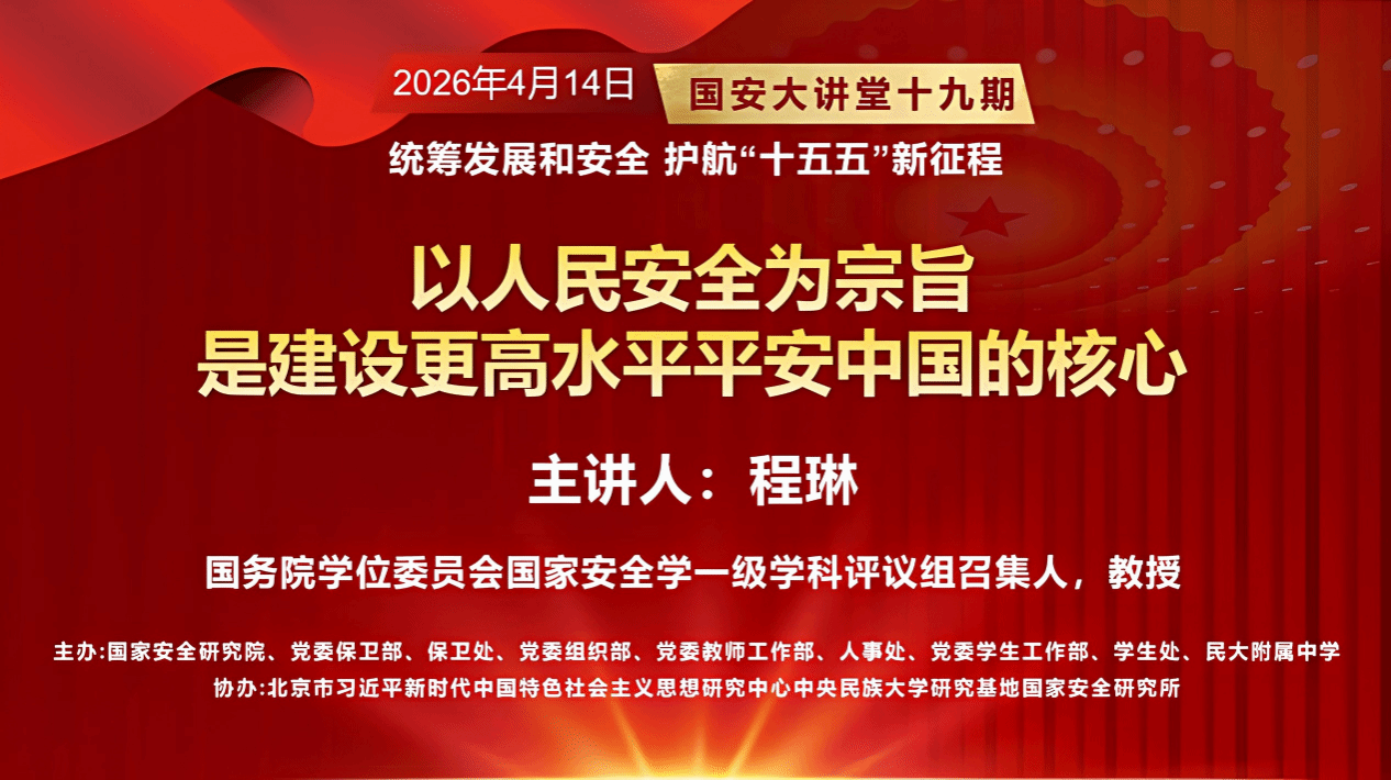 在第十一个“4·15”全民国家安全教育日来临之际,为深入贯彻落实习近平总书记关于全面加强国家安全教育的重要指示精神,推动总体国家安全观深入落实,中央民族大学于2026年4月14日在海淀校区大礼堂举办专题讲座。本次讲座以《以人民安全为宗旨是建设更高水平平安中国的核心》为题,特邀国务院学位委员会国家安全学一级学科评议组召集人、中国人民公安大学原党委书记、校长程琳教授主讲,中央民族大学党委副书记、校长强世功教授在活动前与程琳教授进行了亲切交流。讲座由计划之家