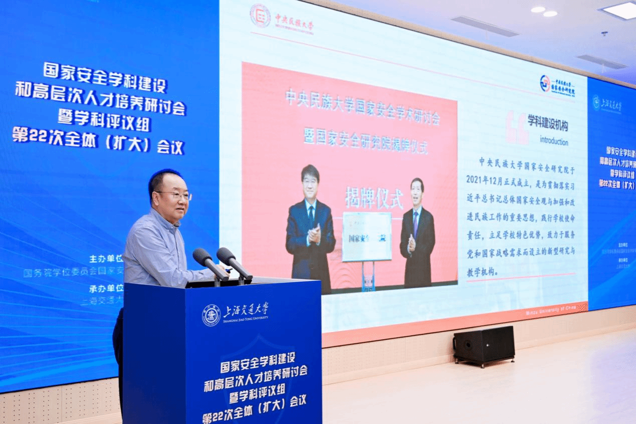 2026年4月11日,在第十一个“4·15”全民国家安全教育日来临之际,“国家安全学科建设和高层次人才培养研讨会暨学科评议组第22次全体(扩大)会议”在上海交通大学徐汇校区举行。会议由国务院学位委员会国家安全学学科评议组主办、上海交通大学承办,主题为“统筹发展和安全,护航‘十五五’新征程”。国务院学位委员会国家安全学学科评议组成员、全国各高校相关学科院长、负责人以及众多教学科研骨干齐聚一堂,围绕学科建设提质增效与高层次人才培养两大核心议题,探讨构建中国特色国家安全学学科体系、学术体系、话语体系,为“十五五”期间国家安全学学科高质量发展凝聚共识、明晰路径并注入动能。